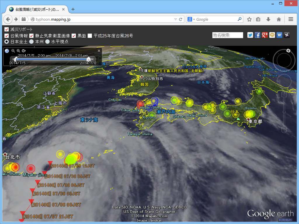 (Neoguri)”の進路と状態、日本各地から寄せられた台風の被害情報や減災に役立つ情報などをリアルタイムで閲覧できますので、利用してはどうでしょうか?どうか、大きな被害が出ませんように。