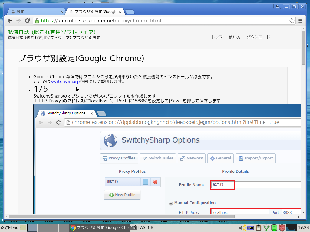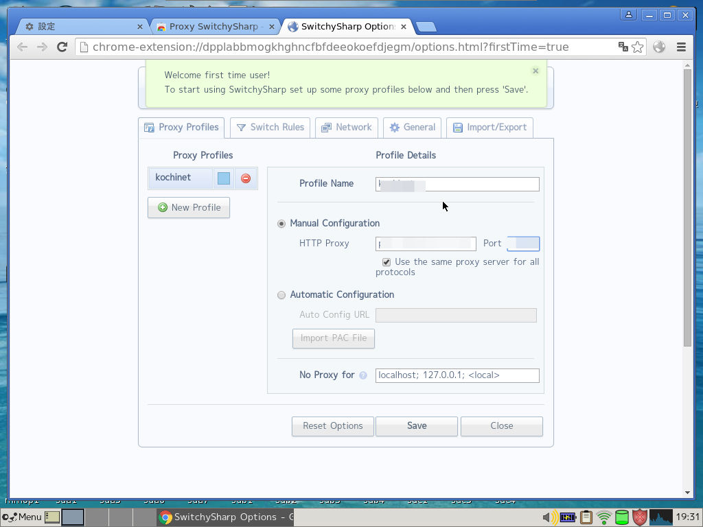 7 「SwitchySharp」を起動して、プロキシーサーバーを設定します。
